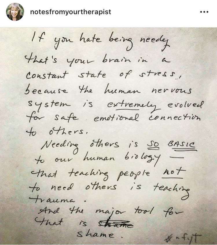 Eğer ihtiyaç sahibi olmaktan nefret ediyorsan, sürekli bir stres halindesin demektir. Çünkü insan sinir sistemi başkalarıyla güvenli duygusal bağlantılar kurmak üzere gelişmiştir. Başkasına ihtiyaç duymak insan biyolojisi için çok temel bir hal. İnsanlara başkasına ihtiyaç duymamayı öğretmek travmayı öğretmek demek. Ve bu utanç duygusu aracılığıyla öğretiliyor.